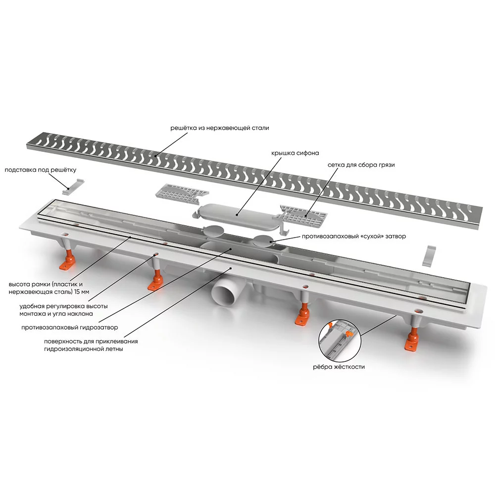 Низкая монтажная высота 50 мм, комбинированный затвор - гидрозавтор + сухой затвор, удобная регулировка высоты монтажа и угла наклона желоба от 65 мм до 87 мм, высота рамки желоба 15 мм, усиление корпуса желоба ребрами жесткости, удобный доступ для чистки сифона, рама из нержавеющей стали